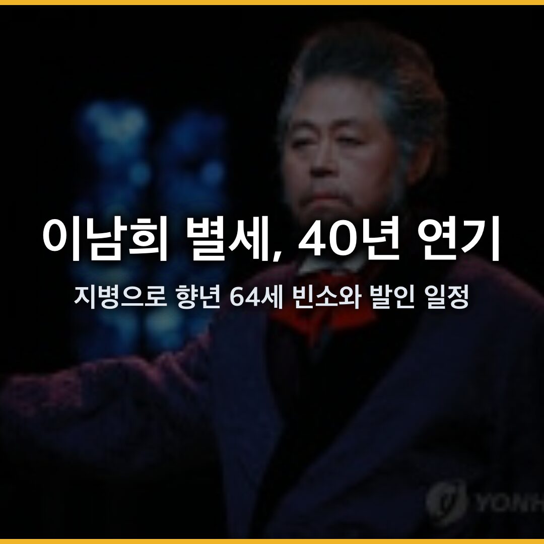 베테랑 배우 이남희가 2026년 4월 22일 오후 5시 지병으로 세상을 떠났다. 향년 64세로 40여 년 간 연극과 영화 무대를 빛낸 그의 갑작스러운 소식에 연예계와 팬들이 큰 충격을 받고 있다. 세브란스병원 장례식장 15호실에 마련된 빈소는 24일 오전 10시20분 발인을 앞두고 조문객들로 붐비고 있다.